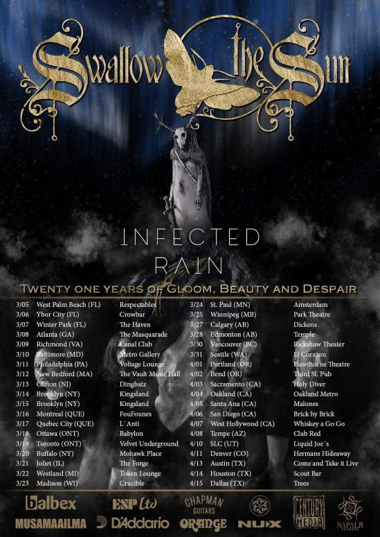 Swallow The Sun have postponed their North American tour with Infected Rain due to the coronavirus pandemic. The trek will now take place in spring 2021.