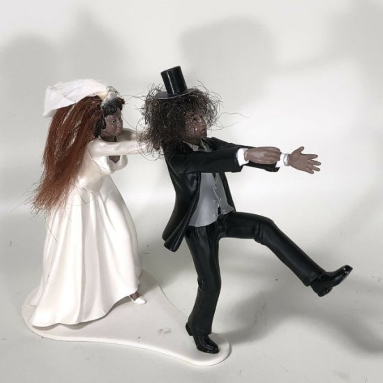 “This is one of the most unusual Slash items maybe ever. This is Slash’s wedding cake topper from his wedding to Perla Hudson. The topper has been customized with Slash and Perla’s actual hair and a custom made little top hat. In Excellent condition!! (See pics) The tips of the fingers on the Slash figures right hand are broken, overall really looks excellent. Item measures approx 5” tall. Displays very well. Comes with Certificate of Authenticity and Letter of Authenticity. Guaranteed 100% authentic. From the Collection of Slash & Perla Hudson. This is a truly rare and unusual piece from Slash’s life. Just incredible. Please message me with any questions. And please check my other auctions, I’m selling a few other items from Slash’s personal collection this month.”
