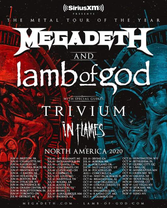 “The summer leg of the metal tour of the year with Megadeth and Lamb Of God, plus special guests Trivium and In Flames, is being rescheduled to 2021. As soon as the new dates are finalized we’ll share the updated schedule. And all tickets will be honored accordingly. If you are a ticket holder and would prefer a refund, please visit LiveNation.com/refund for information on how and when you can claim your refund.