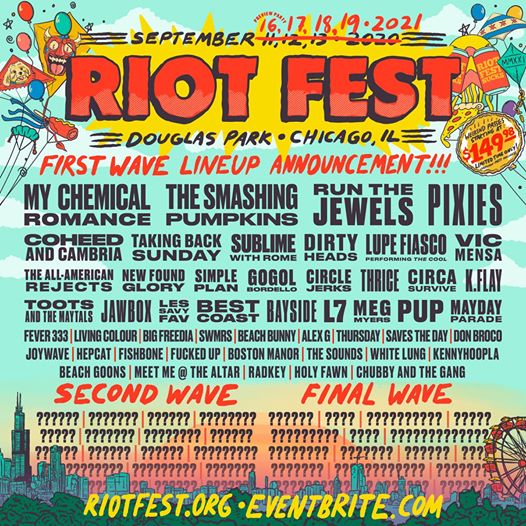 Riot Fest will not be taking place this year due to the coronavirus pandemic. However, the event will be returning to Douglas Park in Chicago, IL on September 16-19, 2021. Here’s the initial lineup: My Chemical Romance, Smashing Pumpkins, Run The Jewels, Pixies, Coheed And Cambria, Taking Back Sunday, Sublime With Rome, Dirty Heads, Lupe Fiasco (performing “The Cool“), Vic Mensa, The All-American Rejects, New Found Glory, Simple Plan, Gogol Bordello, Circle Jerks, Thrice, Circa Survive, K.Flay, Toots And The Maytals, Jawbox, Les Savy Fav, Best Coast, Bayside, L7, Meg Myers, Pup, Mayday Parade, Fever 333, Living Colour, Big Freedia, SWMRS, Beach Bunny, Alex G, Thursday, Saves The Day, Don Broco, Joywave, Hepcat, Fishbone, Boston Manor, The Sounds, White Lung, Kennyhoopla, Beach Goons, Meet Me @ The Altar, Radkey, Holy Fawn, and Chubby And The Gang.