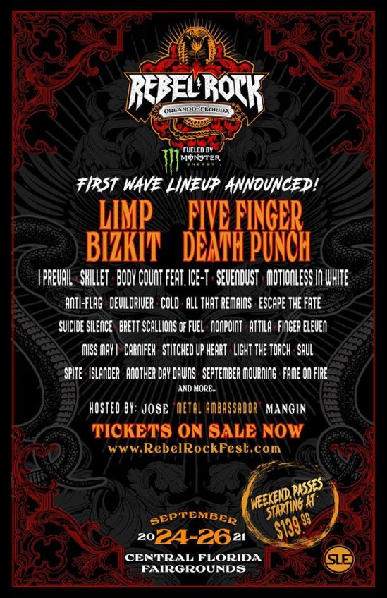 The Rebel Rock festival has been postponed due to the coronavirus pandemic. The event will now be held at the Orlando Amphitheater at Central Florida Fairgrounds in Orlando, FL on September 24-26, 2021. There will also be a pre-party on September 23. Here’s the initial lineup: Limp Bizkit, Five Finger Death Punch, I Prevail, Skillet, Body Count, Sevendust, Motionless In White, Anti-Flag, DevilDriver, Cold, All That Remains, Escape The Fate, Suicide Silence, Brett Scallions (Fuel), Nonpoint, Attila, Finger Eleven, Miss May I, Carnifex, Stitched Up Heart, Light The Torch, Saul, Spite, Islander, Another Day Dawns, September Mourning, and Fame On Fire.