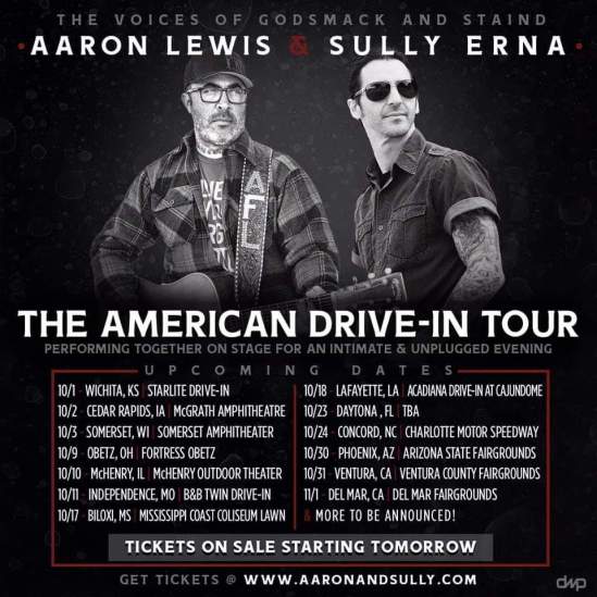 Aaron Lewis (Staind) and Sully Erna (Godsmack) will be joining forces for “The American Drive-In Tour” this fall. Tickets will go on sale tomorrow (September 15) via aaronandsully.com.