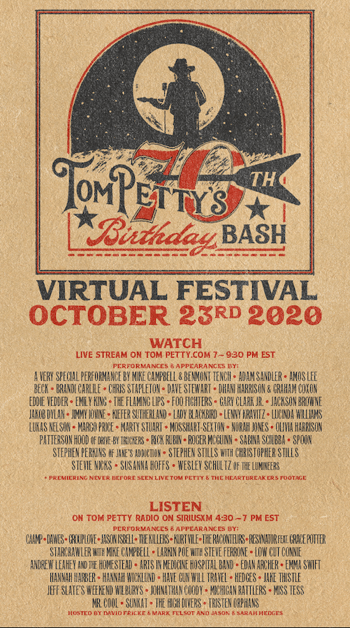 Due to the ongoing pandemic, this year’s special Tom Petty Birthday Bash, honoring what would have been his 70th birthday (today), will be held virtually on Friday, October 23 with 5 hours of performances, testimonials and tributes to Tom from friends and fans including Stevie Nicks, Chris Stapleton, Post Malone, Foo Fighters, The Killers, Norah Jones, The Raconteurs, Jason Isbell, a very special performance by Mike Campbell and Benmont Tench and many more.”