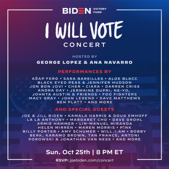 Foo Fighters and Jon Bon Jovi are among the artists set to perform at tonight’s (October 25) “I Will Vote” concert in support of Joe Biden and Kamala Harris. That event will be hosted by George Lopez and Ana Navarro and it will also feature: A$AP Ferg, Sara Bareilles, Aloe Blacc, Black Eyed Peas (with Jennifer Hudson), Cher, Ciara, Darren Criss, Andra Day, Macy Gray, John Legend, Dave Matthews, P!nk, and more. The show will start at 8:00 p.m. ET. and fans can gain access to it by donating at joebiden.com/concert.