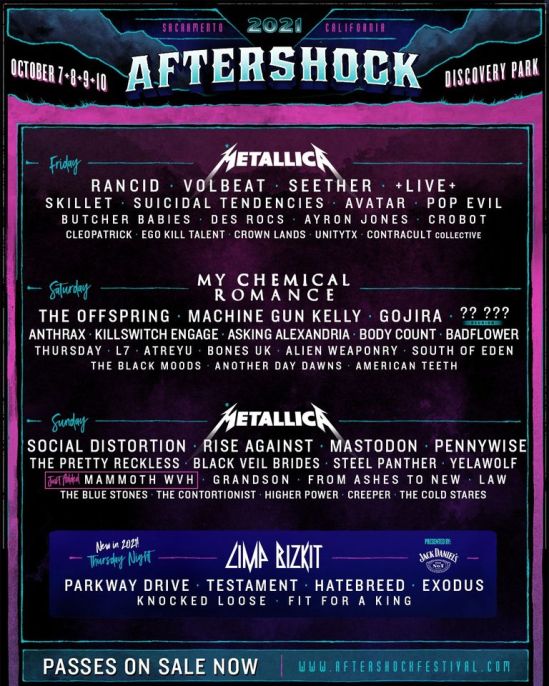 October 9: My Chemical Romance, The Offspring, Machine Gun Kelly, Gojira, Anthrax, Killswitch Engage, Asking Alexandria, Body Count, Badflower, Thursday, L7, Atreyu, Bones UK, South Of Eden, The Black Moods, Another Day Dawns, and American Teeth.