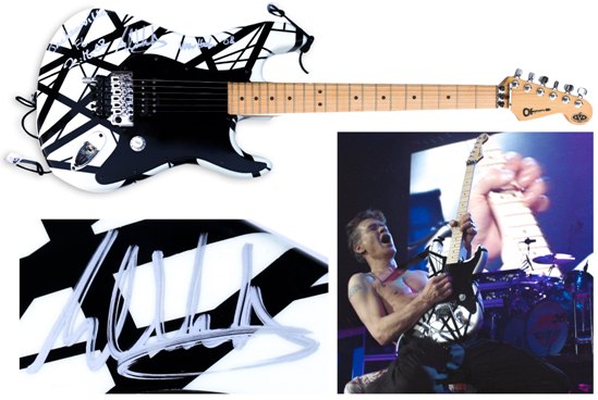 “Eddie Van Halen personally designed (hand-striped) custom guitar, owned and played onstage by Eddie at the 16 February 2008 show in Jacksonville, Florida. Charvel guitar is signed by Eddie in silver marker, with the Jacksonville concert date also written by him as well as ”Van Halen ’08”. In custom EVH (Eddie Van Halen) Charvel guitar case, and with COA signed by Eddie Van Halen showing serial number of 173, matching EVH plate on guitar. Near fine condition. A fantastic rock collectible personally designed, played and signed by one of the greatest guitar players of all time.”