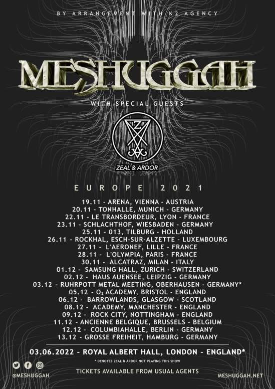 Meshuggah have announced a fall 2021 European/UK tour with Zeal & Ardor. You can find the dates for that trek below.