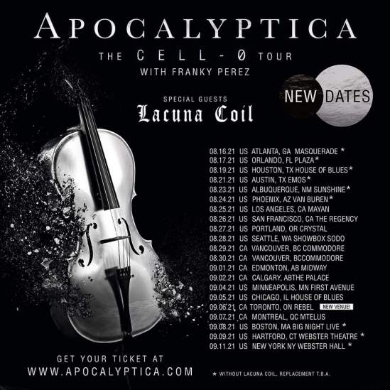 Apocalyptica have postponed their North American tour with Lacuna Coil due to the coronavirus pandemic. The trek is now scheduled to take place in August/September 2021. However, Lacuna Coil will no longer appear on every date.
