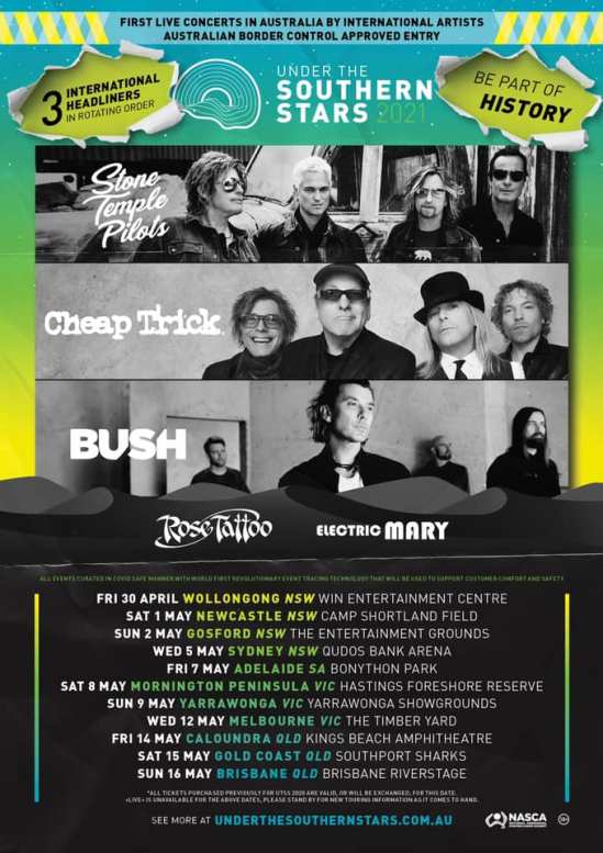 Stone Temple Pilots, Cheap Trick, Bush, Rose Tattoo, and Electric Mary have postponed their Australian tour due to the coronavirus pandemic. The trek is now scheduled to take place this spring. Here’s the dates: