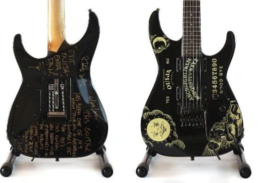 Metallica guitarist Kirk Hammett’s Oujia Board guitar is now up for auction via Gotta Have Rock And Roll. According to the product description, Hammett “played and used this guitar on stage frequently” and it “was used extensively for the albums: ‘Load,’ ‘Reload,’ ‘Garage Inc.,’ ‘The Black Album’ and ‘S&M’.” The winning bidder will also receive “the original photographs of Hammett presenting the guitar to the current owner, the signed stage used guitar strap and the original touring case.”
