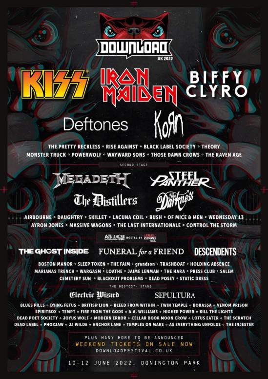 Main Stage: KISS, Iron Maiden, Biffy Clyro, Deftones, Korn, The Pretty Reckless, Rise Against, Black Label Society, Theory Of A Deadman, Monster Truck, Powerwolf, Wayward Sons, Those Damned Crows, and The Raven Age.