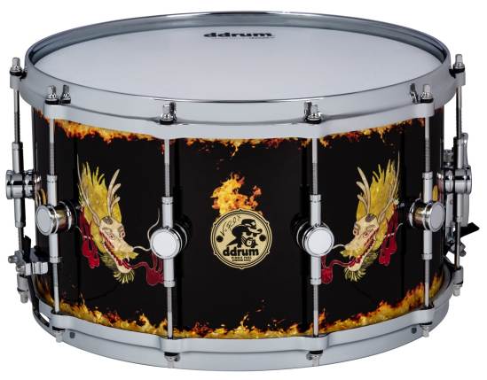 “Large and in charge, the Vinnie Paul signature snare takes a maple wood snare to its tonal extreme. Crafted from 8 plies of North American maple, this snare delivers a thunderous punch to the chest, with a high caliber crack on top. 10 double sided turret lugs combined with the die cast hoops to add tuning stability and provide a solid rim shot sound. Available for its initial run in a special Delmar dragon wrap with chrome shell hardware to complement and enhance any finish kit to which it is added. Premium carrying case completes this heavy hitting package.”