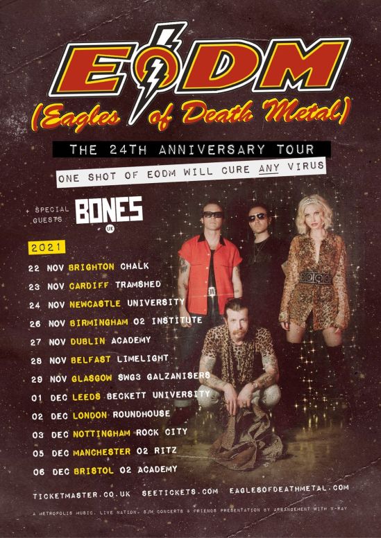 Eagles Of Death Metal will be celebrating their 24th anniversary on a UK tour this fall. Bones UK will serve as support. Here’s the dates: