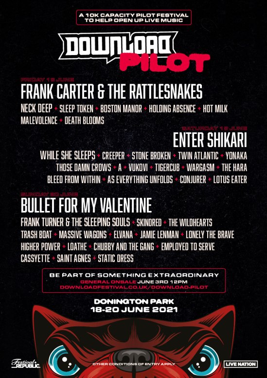 The lineup has been revealed for the upcoming “Download Pilot” festival. The event, which will serve as a reintroduction to live music in the UK, will be held at Donington Park on June 18-20. The festival will be limited to 10,000 people and all attendees will be required to get tested for COVID-19 before entering. Here’s the daily lineups: