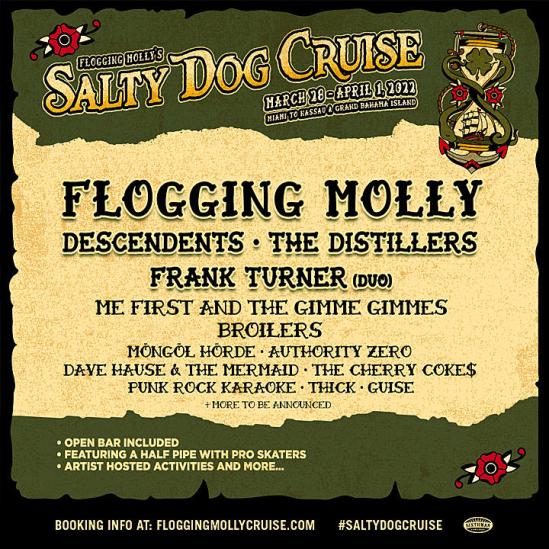 “Ahoy Shipmates! The time for shenanigans on the high seas has finally arrived. We are so proud to announce the return of The Salty Dog cruise 2022. As always we’ll be joined by an amazing bunch of bands to accompany the many cocktails we all deserve after the very strange year and a half we’ve all experienced. So, pack the sunscreen and get ready for the one thing we’ve all missed…..FUN TIMES!! Looking so forward to seeing you all… Love Flogging Molly.💚”