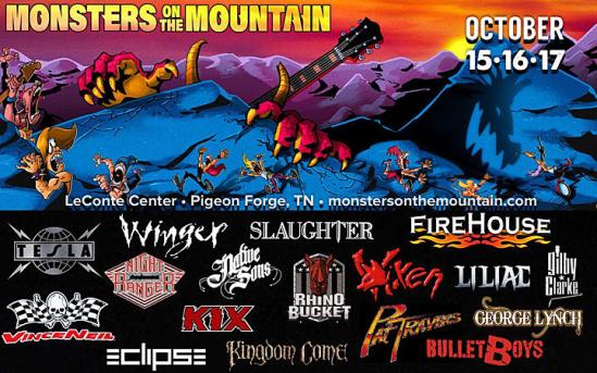 The lineup has been revealed for the inaugural Monsters On The Mountain festival. The event will take place at the LeConte Center in Pigeon Forge, Tennessee on October 15-17 and it will feature the following artists: Tesla, Vince Neil, Night Ranger, Winger, Kix, Slaughter, Firehouse, Eclipse, Pat Travers, BulletBoys, Vixen, Kingdom Come, Lynch Mob, Rhino Bucket, Liliac, Native Sons, Gilby Clarke, John Corabi, Anthony Corder, Mark Evans, Randy Hansen, Jeff Scott Soto, and Jason Bieler. Former “That Metal Show” hosts Eddie Trunk, Don Jamieson, and Jim Florentine will host the festival. SiriusXM’s Boneyard and Hair Nation will also help keep the party going as well.