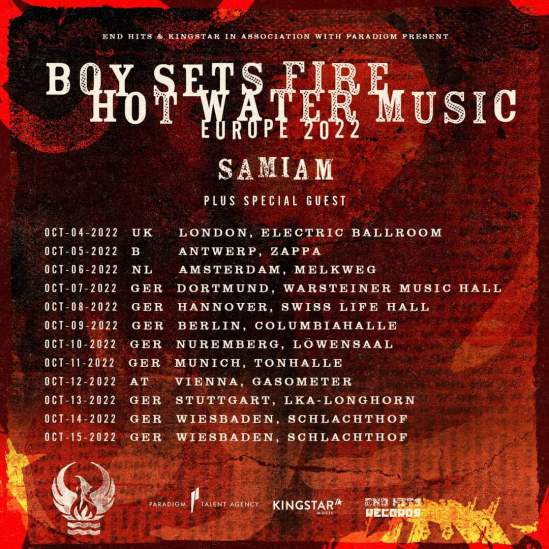 Boysetsfire, Hot Water Music, and Samiam have announced a 2022 European/UK tour. Here’s the dates: