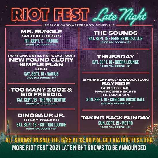 Several late night afterparty shows have booked around the Riot Fest in Chicago, IL. Those concerts include: