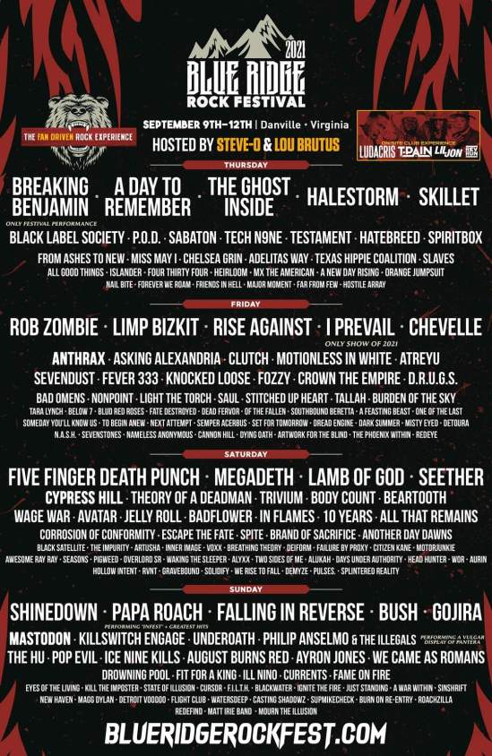 September 10: Rob Zombie, Limp Bizkit, Rise Against, I Prevail, Chevelle, Anthrax, Asking Alexandria, Clutch, Motionless In White, Atreyu, Sevendust, Fever 333, Knocked Loose, Fozzy, Crown The Empire, D.R.U.G.S., Bad Omens, Nonpoint, Light The Torch, Saul, Stitched Up Heart, Tallah, Burden Of The Sky, Tara Lynch, Blud Red Roses, Fate Destroyed, Dead Fervor, Of The Fallen, Southbound Beretta, A Feasting Beast, One Of The Lost, Someday You’ll Know Us, To Begin Anew, Next Attempt, Semper Acerbus, Set For Tomorrow, Dread Engine, Dark Summer, Mistry Eyed, Detoura, N.A.S.H., Sevenstones, Nameless Anonymous, Cannon Hill, Dying Oath, Artwork For The Blind, The Phoenix Within, and Redeye.