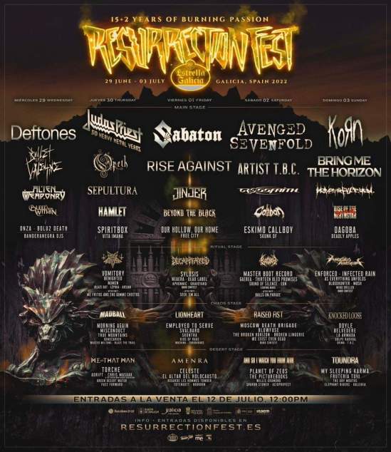 The lineup has been revealed for the 2022 Resurrection Fest. That event will take place on June 29 – July 3 in Galicia, Spain and it will feature: Avenged Sevenfold, Korn, Judas Priest, Deftones, Sabaton, Bring Me The Horizon, Rise Against, Opeth, Bullet For My Valentine, Heaven Shall Burn, Sepultura, Jinjer, Crossfaith, Madball, Dark Funeral, Raised Fist, Amenra, Rise Of The Northstar, Bloodbath, Decapitated, Me And That Man, Lionheart, Sylosis, Knocked Loose, Toundra, Angelus Apatrida, Alien Weaponry, Caliban, Hamlet, Doyle, Vomitory, Morning Again, Moscow Death Brigade, Spiritbox, Eskimo Callboy, Neaera, Employed To Serve, Dagoba, Beyond The Black, And So I Watch You From Afar, Enforced, Planet of Zeus, Infected Rain, The Picturebooks, Belvedere, Torche, and more.