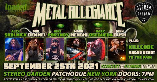 Metal Allegiance will be performing at Stereo Garden in Patchogue, NY on September 25. The event will feature core members Mike Portnoy (ex-Dream Theater, etc.), Mark Menghi, and Alex Skolnick (Testament) as well as Phil Demmel (Vio-lence, ex-Machine Head), Mark Osegueda (Death Angel), and John Bush (Armored Saint, ex-Anthrax).