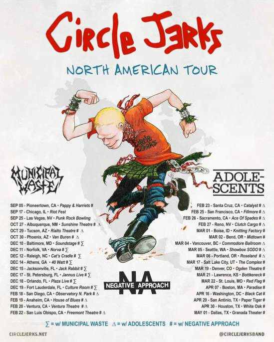Circle Jerks have announced a headlining North American tour. Adolescents, Municipal Waste, and Negative Approach will open on select dates.