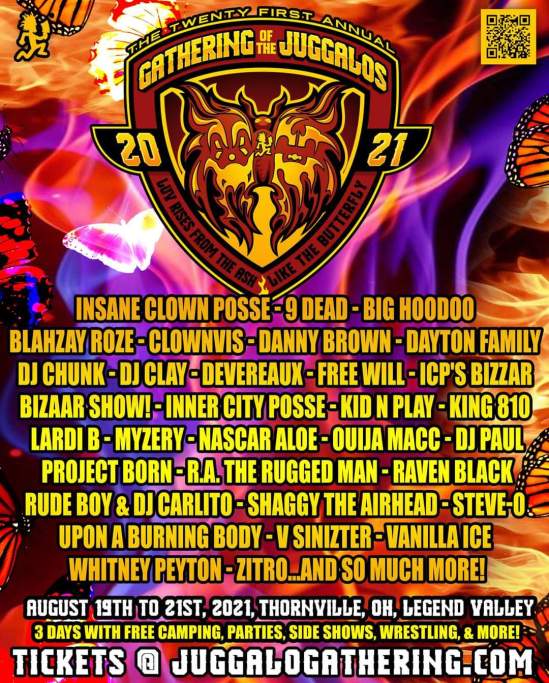 Insane Clown Posse have officially revealed the lineup for this year’s Gathering Of The Juggalos. The event will take place on August 19-21 at Legend Valley in Thornville, OH and it will feature: Insane Clown Posse, Upon A Burning Body, King 810, Raven Black, 9 Dead, Big Hoodoo, Kid N Play, Whitney Peyton, Vanilla Ice, and more.