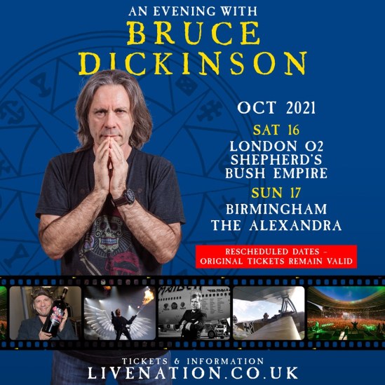 As previously reported, Iron Maiden’s Bruce Dickinson recently postponed the last two dates on his spoken word tour due to a positive COVID-19 test within his household. Now, the frontman has officially announced the rescheduled dates for both events: