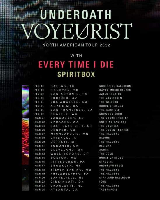 Underoath have announced a 2022 North American tour with Every Time I Die and Spiritbox. The band will be touring in support of their new album “Voyeurist” (out January 14).