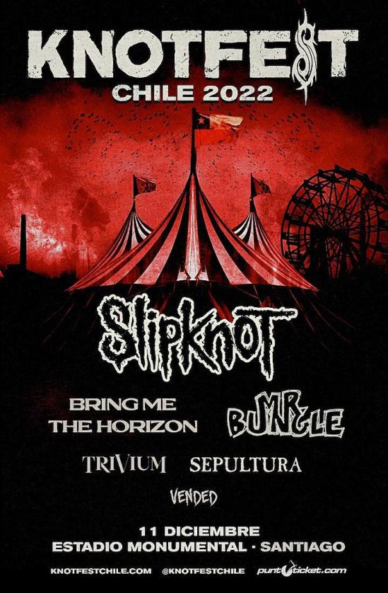 Slipknot have revealed the lineups for the 2022 Knotfest Chilie and Knotfest Brasil festivals. Knotfest Chile will take place at Estadio Monumental in Santiago, Chile on December 11 and it will feature: Slipknot, Bring Me The Horizon, Mr. Bungle, Trivium, Sepultura, and Vended. Knotfest Brasil will take place at the Sambódromo do Anhembi in São Paulo, Brazil on December 18 and it will feature: Slipknot, Bring Me The Horizon, Mr. Bungle, Trivium, Sepultura, Motionless In White, Vended, Project46, and Armored Dawn.