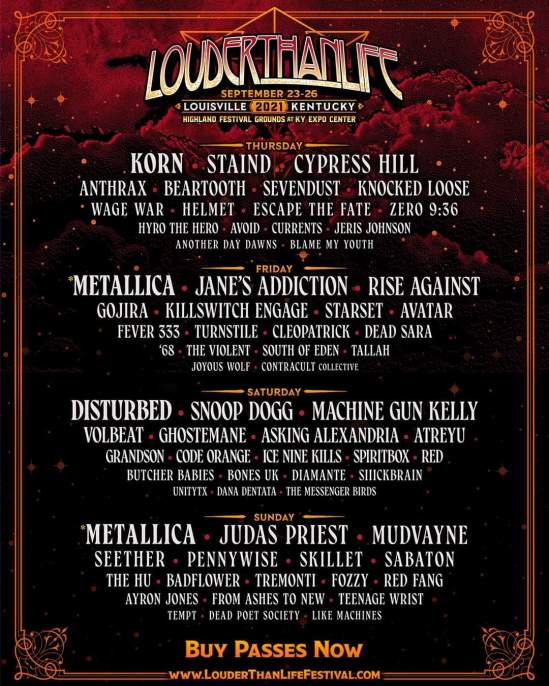 September 23: Korn, Staind, Cypress Hill, Anthrax, Beartooth, Sevendust, Knocked Loose, Wage War, Helmet, Escape The Fate, Zero 9:36, Hyro The Hero, Avoid, Currents, Jeris Johnson, Another Day Dawns, and Blame My Youth.