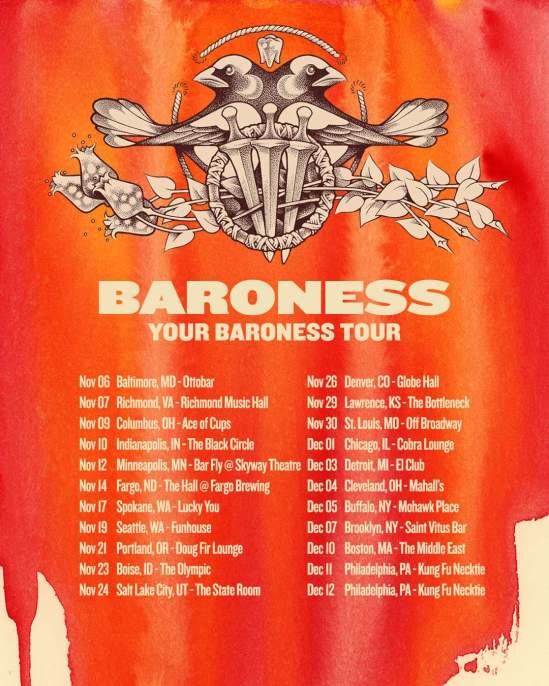 “I cannot remember any moment in the history of this band where we’ve been more excited to tour than we are today. In many ways, this upcoming tour feels similar the very first Baroness tour in 2003: we don’t know what to expect, we’re through sitting on the sidelines, and we can’t wait to climb onstage.