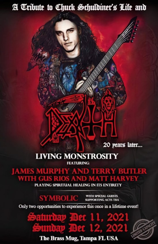 Former Death guitarist James Murphy and bassist Terry Butler will be commemorating the 20th anniversary of frontman Chuck Schuldiner’s death with two tribute shows at The Brass Mug in Tampa, FL. The concerts will be held on December 11-12 and they will find Murphy and Butler playing “Spiritual Healing” in full with Gruesome drummer Gus Rios and Exhumed frontman Matt Harvey. Death tribute band Symbolic will also perform.