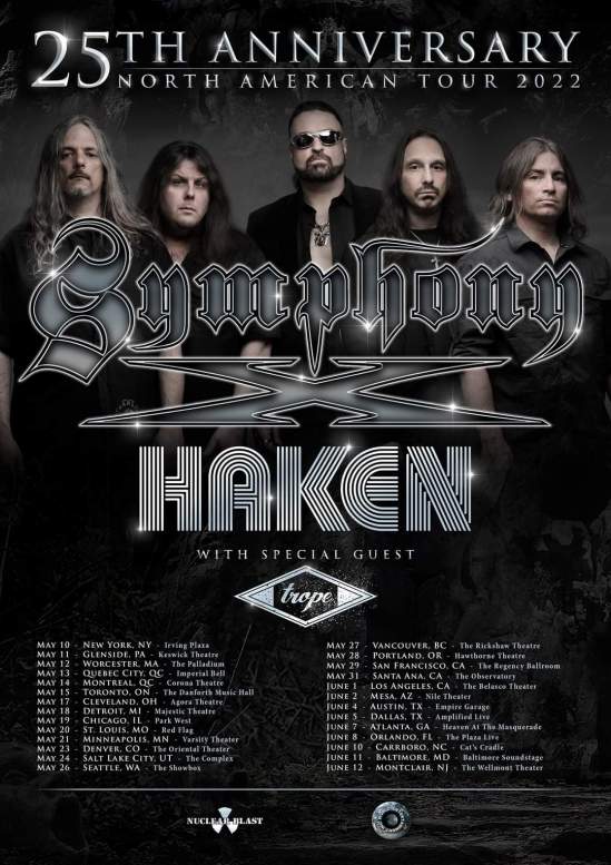 Symphony X will be celebrating their 25th anniversary on a North American tour next year. The band will also be joined by Haken and Trope on this run.