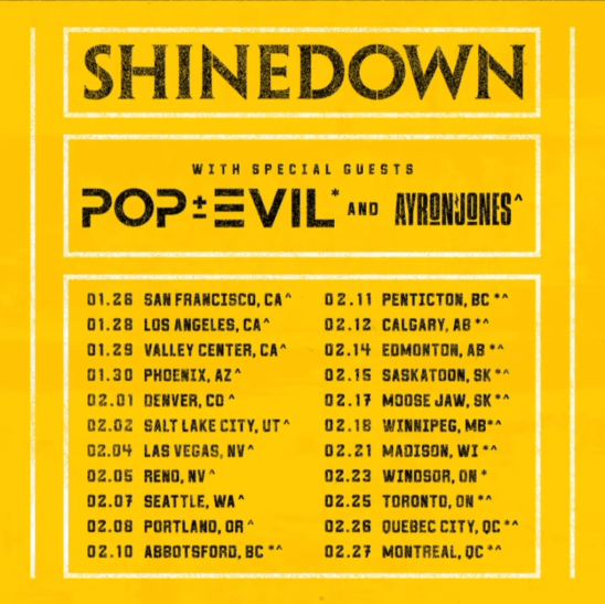 Shinedown have announced a headlining North American tour. Pop Evil and Ayron Jones will open on select dates.