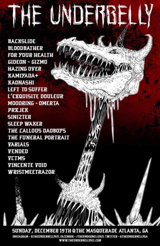 The lineup has been revealed for the inaugural edition of The Underbelly Music Festival. The event will take place at the Masquerade in Atlanta, GA on December 19 and it will feature: Backslide, Bloodbather, For Your Health, Gideon, Gizmo, Hazing Over, Kaonashi, Kamayada+, L’exquisite Douleur, Left to Suffer, Moodring, Omerta, Prxjek, Sinizter, Sleep Waker, The Callous Daoboys, The Funeral Portrait, Varials, Vctms, Vended, Vincente Void, and Wristmeetrazor.