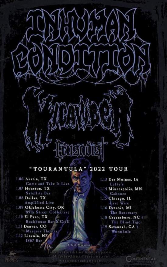 Inhuman Condition (Obituary, The Absence) have announced a January tour with Micawber and Crusadist. Here’s the dates: