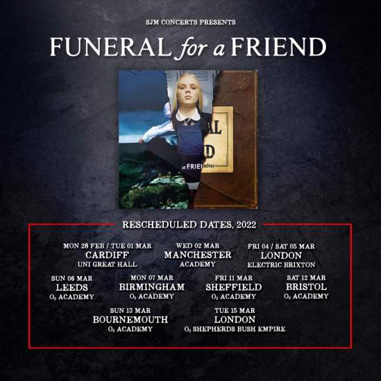It’s with great regret that recent governmental restrictions have left us with no choice but to postpone our January tour. Whilst this news is disappointing, you can rest assured that we’ve been working behind the scenes to ensure that these shows WILL go ahead when it’s safe and feasible to do so, and we have already confirmed new dates for this run starting at the end of February and into March (Glasgow and Newcastle dates to be announced shortly). All tickets will remain valid, and limited tickets still remain for Leeds and Bournemouth at www.funeralforafriend.co.uk.