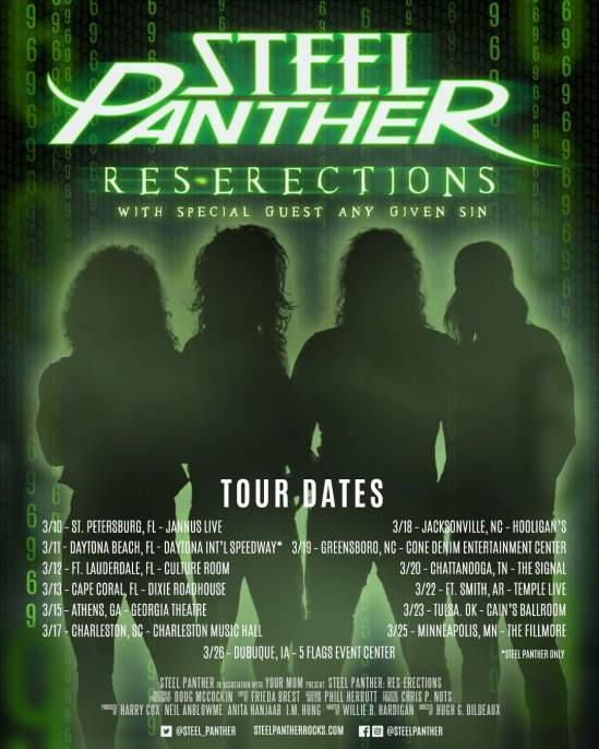 Steel Panther have announced the dates for the first leg of their “Res-Erections” tour. The trek will take place in March with Any Given Sin set to open.