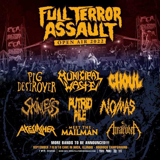 The initial lineup has been revealed for this year’s Full Terror Assault Open Air festival. The event will take place at the Hogrock Campground in Cave-In-Rock, IL on September 7-10 and it will feature the following: Pig Destroyer, Municipal Waste, Ghoul, Skinless, Putrid Pile, No/Más, Axeslasher, Meet The Mailman, and Airacobra.