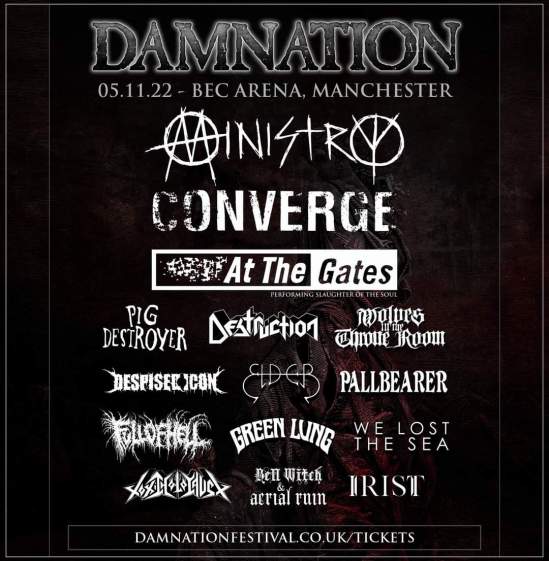 At The Gates have announced that they will be performing “Slaughter Of The Soul” in its entirety during the 2022 Damnation Festival. That event will be held at the BEC Arena in Manchester, UK on November 5 and it will also feature: Ministry, Converge, Pig Destroyer, Destruction, Wolves In The Throne Room, Despised Icon, Elder, Pallbearer, Full Of Hell, Green Lung, We Lost The Sea, Toxic Holocaust, Bell Witch & Aerial Ruin, and Irist.