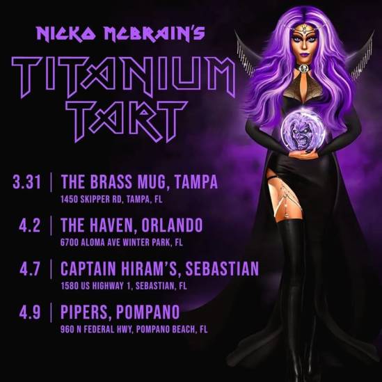 Nicko McBrain will be performing Iron Maiden songs with his Titanium Tart project during a short Florida tour. Here’s the dates for that run: