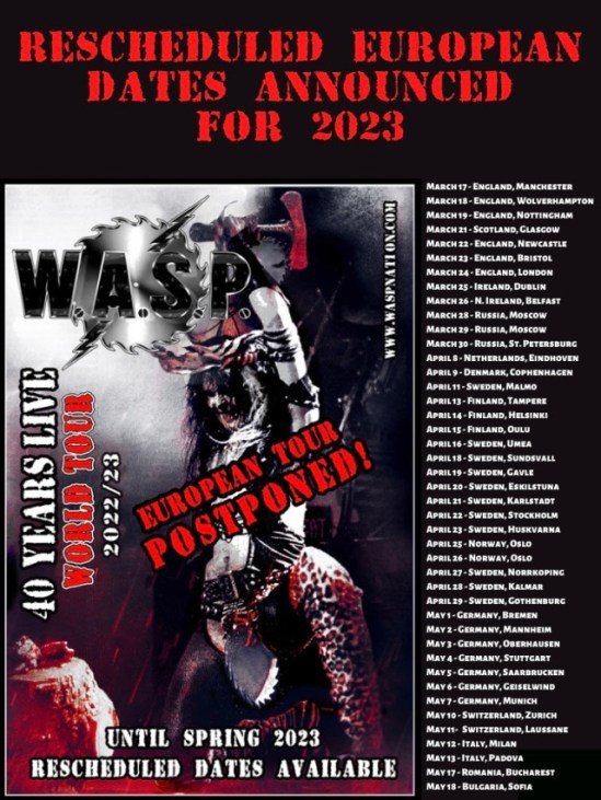 W.A.S.P. have postponed the European/UK leg of their 40th anniversary tour. The trek is now scheduled for 2023.
