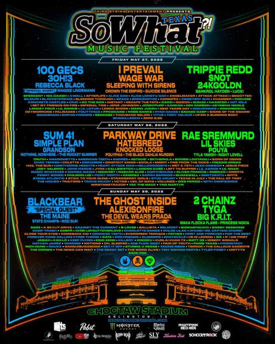 Wage War, Lil Skies, Mod Sun, Pouya, State Champs, Hail The Sun, Rebecca Black, Kublai Khan, Hawthorne Heights, Big K.R.I.T., and Oxymorrons have all been added to the 2022 So What?! Music Festival. That event will take place at Choctaw Stadium in Arlington, Texas on May 27-29 and the updated daily lineups can be seen in the below poster: