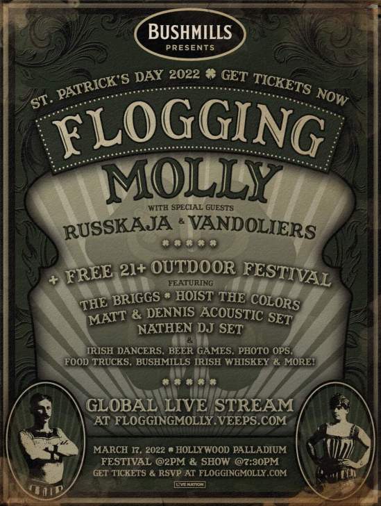 “Bushmills Presents: Flogging Molly LIVE from Los Angeles this St. Patrick’s Day! ☘️ Join us as we return to The Hollywood Palladium for an in-concert AND global streaming performance on March 17th, 2022, plus the grand re-opening of our FREE annual outdoor festival – featuring a day stacked with live performances, beer, food, games and more! In addition to our festival and streaming performance, it’s with much excitement, that we also announce the release of our brand-new single “These Times Have Got Me Drinking”, arriving worldwide on March 10th through Rise Records. We can’t wait share this one with you all, and to kick off the celebration back in Los Angeles where it all began. Get Tickets, Merch, and Pre-Save “These Times Have Got Me Drinking” now here: linktr.ee/floggingmolly“