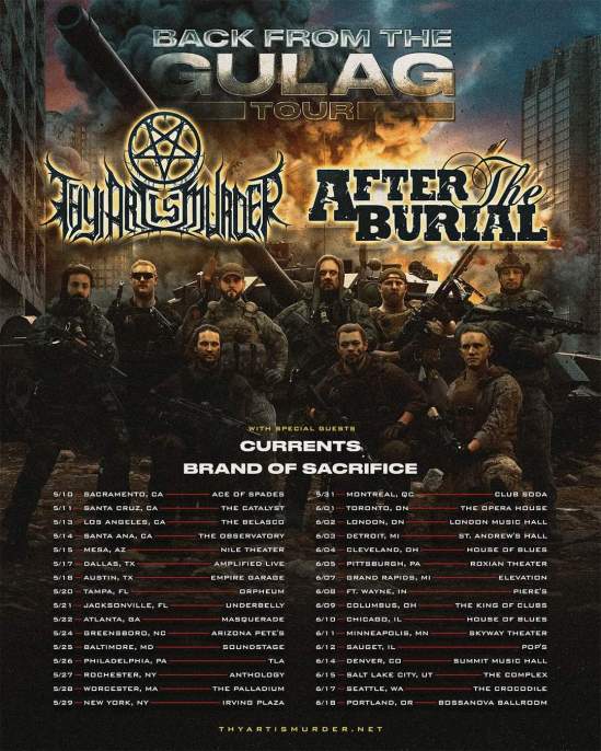 Thy Art Is Murder and After The Burial have announced a co-headlining North American tour. Currents and Brand Of Sacrifice will serve as support.