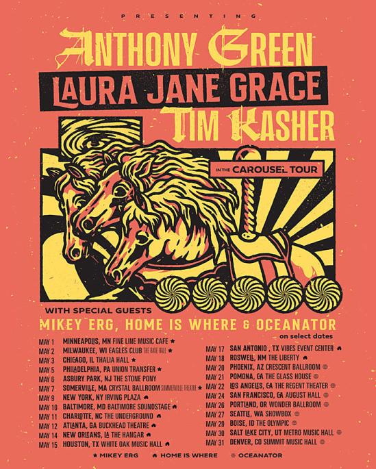Anthony Green (Circa Survive), Laura Jane Grace (Against Me!), and Tim Kasher (Cursive) will be hitting the road on “The Carousel Tour” this May. Oceanator, Mikey Erg, and Home Is Where will open on select dates.