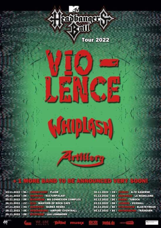 Vio-lence, Whiplash, and Artillery will be hitting the road on this year’s “MTV Headbangers Ball” tour in Europe. Here’s the dates for that run: