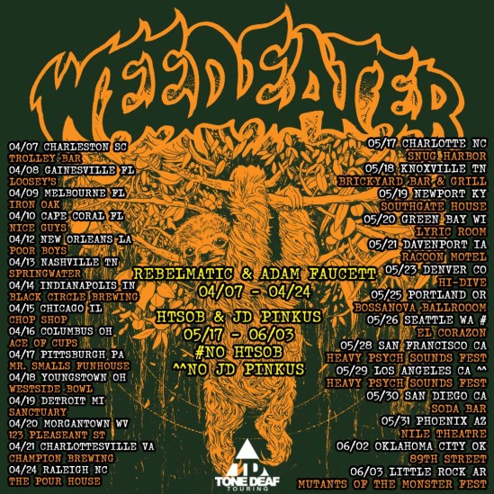 Weedeater have announced a spring headlining tour. Rebelmatic, Adam Faucett, JD Pinkus, and HTSOB will serve as support on select dates.