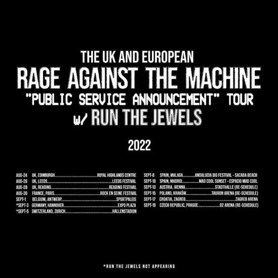 Rage Against The Machine have officially rescheduled their upcoming European/UK tour with Run The Jewels. Here’s the new dates